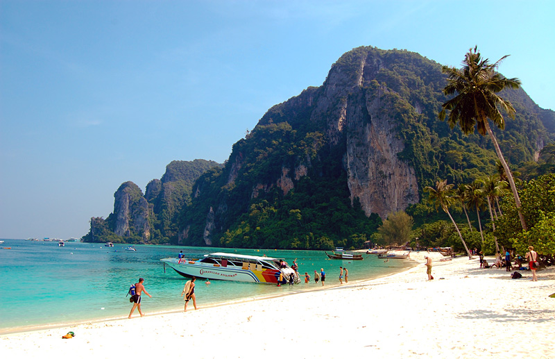 Wir wollen schönere Strände sehen und machen uns deswegen auf den Weg nach Koh Phi Phi. Am Hafen von Koh Phi Phi erwartet uns Mati, das wird lustig! Wir steigen in die wohl heruntergekommensten Bungalows von Phi Phi ab. Aber wir sind uns mittlerweile alles gewohnt. Gleich am ersten Nachmittag gehts mit dem Longtail Boot zum weltberühmten Maya Beach. Dort wurde der Film "The Beach" gedreht. Erinnerungen kommen auf. Und tatsächlich, dieser Beach ist traumhaft. Türkisblaues Wasser umgeben von hohen Klippen und Dschungel. Da wir nicht mit einer Tour unterwegs sind erleben wir etwas wunderbares. Kurz vor Sonnenuntergang sind wir noch genau 7 Leute ganz alleine am Beach. Das gibts eher selten, wir geniessen es in vollen Zügen!